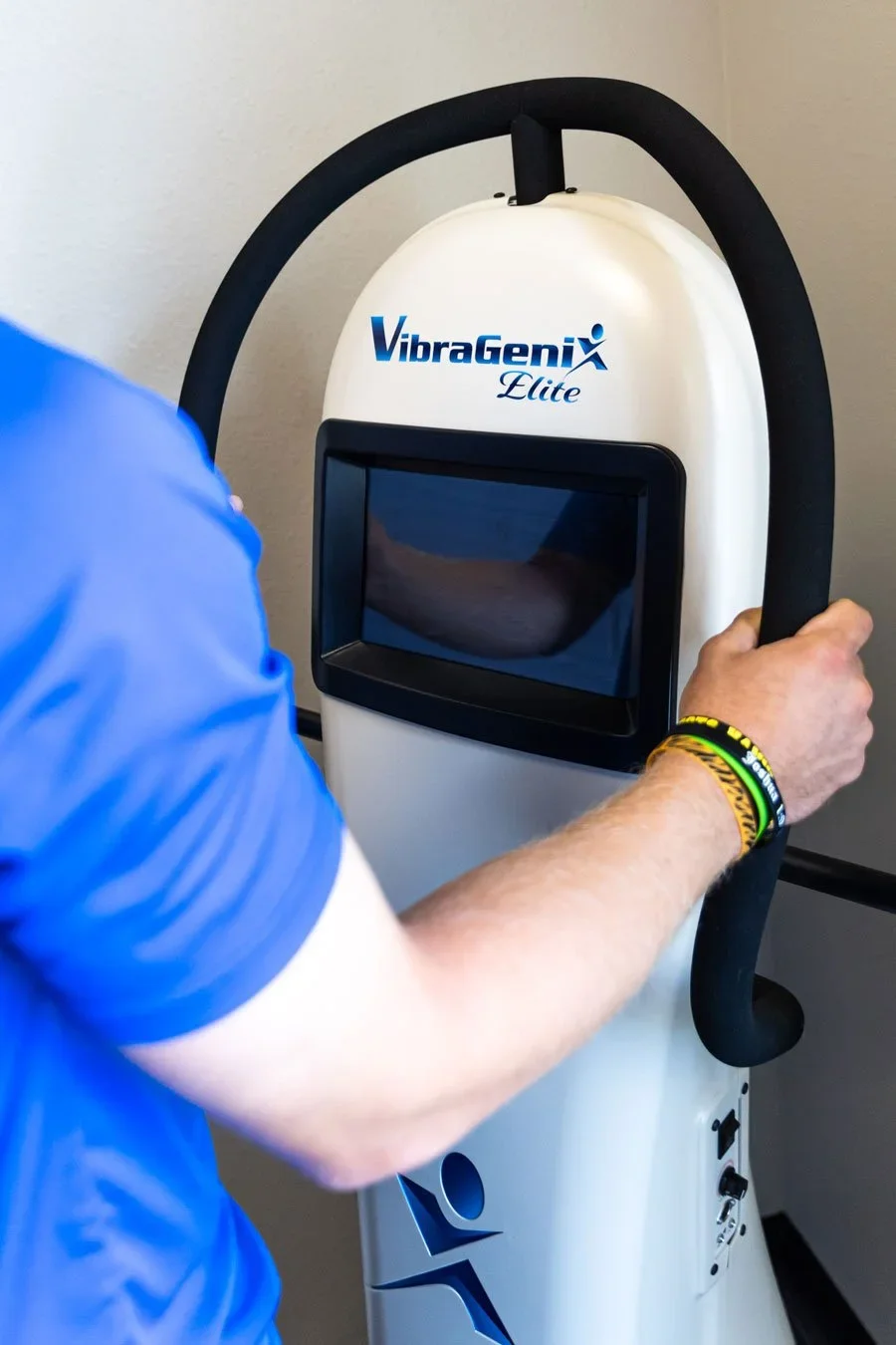 The VibraGenix is a platform driven by soundwave vibration to produce specific healing frequencies while the user stands or sits on it. The biological reaction to sound vibrations increases blood flow, lymphatic drainage and most importantly the voltage of the cells which makes them work more efficiently and heal more quickly.