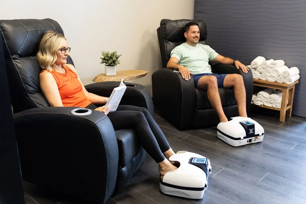 Relax and reduce stress in our massage chairs and accelerate recovery with compression therapy and our Hyperice equipment.